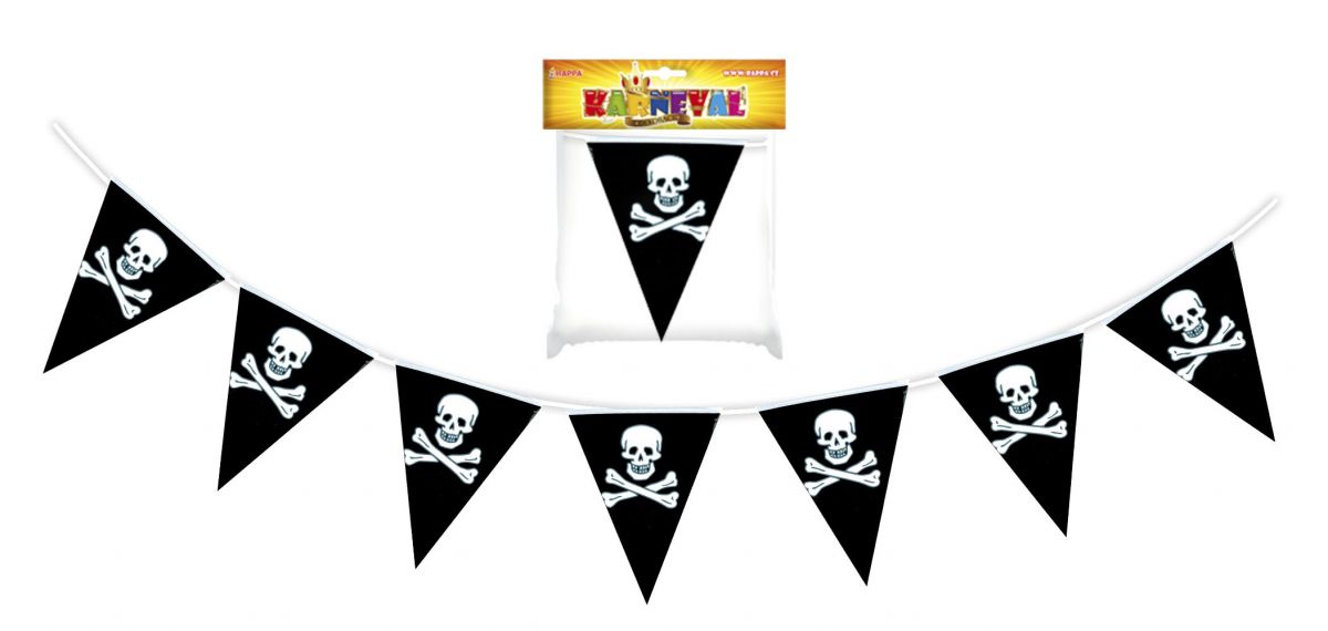 Vyvěste vlajky a připravte se na pořádný pirátský rej! Tato parádní pirátská girlanda o délce 7 metrů je skvělým doplňkem každé tematické akce – ať už chystáte dětskou oslavu, karneval nebo dospělácký mejdan na styl Piráti z Karibiku. Vlajky s klasickým lebkovým motivem dodají prostoru tu správnou atmosféru dobrodružství a mořského nebezpečí.