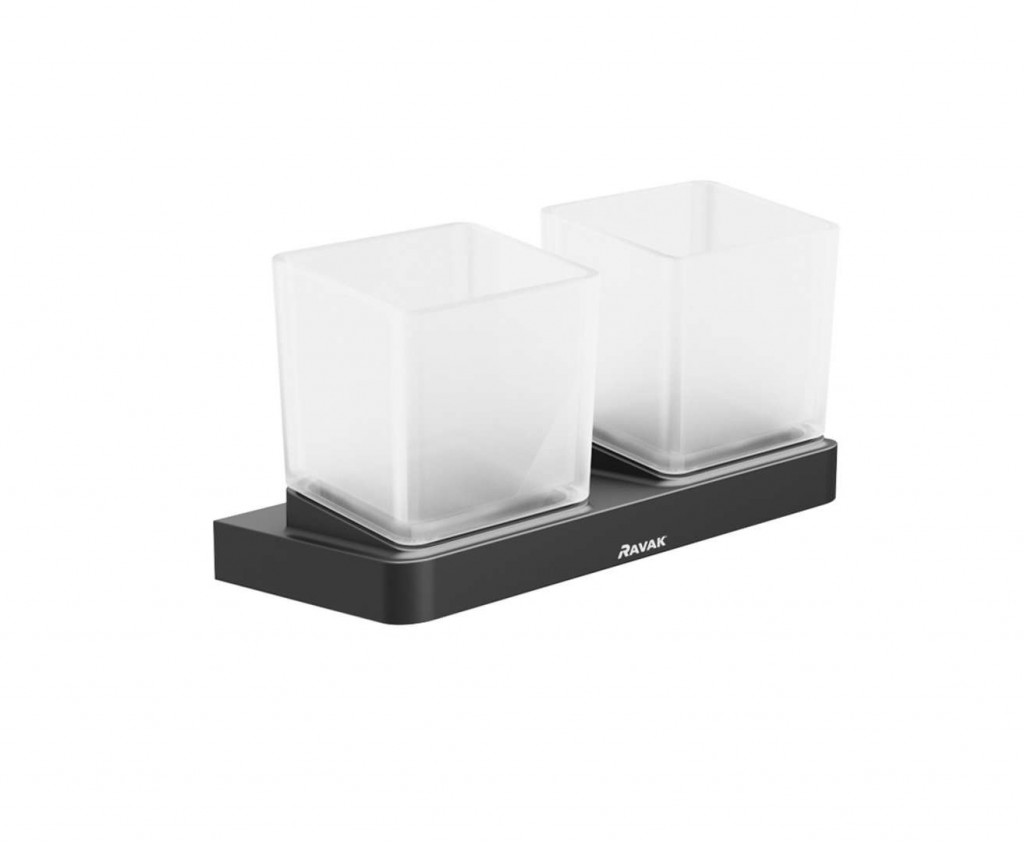 Držák s dvěma pohárky TD 220.20 materiál: chrom/matné sklo provedení: černé montáž na hmoždinky a ustavovací kovovou upínací desku držák je na vnitřní straně opatřen plastovými kroužky pro měkké dosednutí skleněných pohárků Na vnější čištění doporučujeme používat přípravek RAVAK Cleaner Chrome.