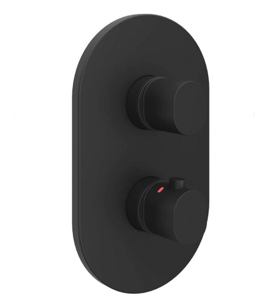 Termostatická podomítková baterie CR II 067.20BL.O3.RB071, bez tělesa barva černá materiál kov rozměry 220 x 126 mm oválný tvar podomítková montáž kohoutkové ovládání bezpečnostní zarážka na 38 °C ochrana proti opaření pro 3 spotřebiče s přepínačem termostatická kartuše Základní těleso není součástí balení.