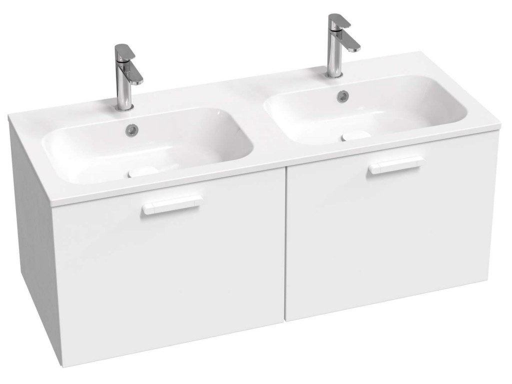Skříňka pod dvojumyvadlo Chrome II barva lesklá bílá materiál impregnovaná deska MFPB a MDF rozměry 1200 x 470 x 490 mm 2 velké zásuvky s tichým dovíráním 1x nízká integrovaná zásuvka 2x madlo 152 mm, bílá instalace zavěšením na zeď dodáváno smontované Umyvadlo a baterie nejsou součástí balení, je třeba objednat zvlášť. Fotografie jsou ilustrativní.