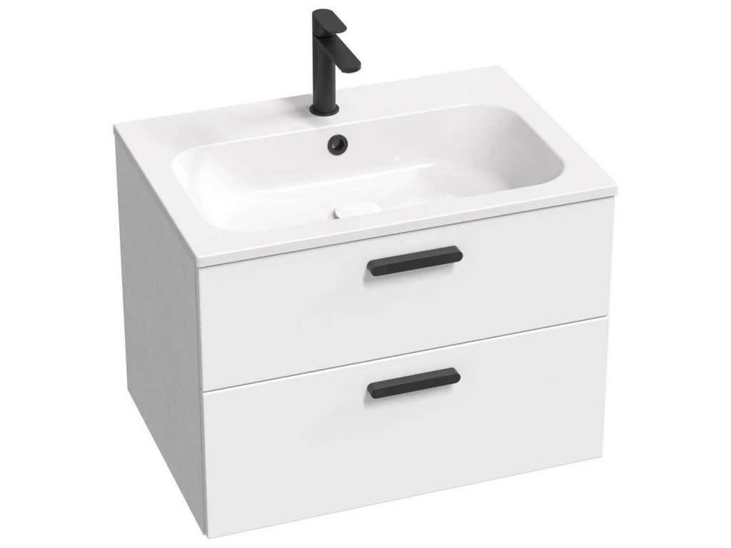 Skříňka pod umyvadlo Chrome II barva lesklá bílá materiál impregnovaná deska MFPB a MDF rozměry 700 x 500 x 490 mm 2 zásuvky s tichým dovíráním 2x madlo 152 mm, černá instalace zavěšením na zeď dodáváno smontované včetně montážního příslušenství Umyvadlo a baterie nejsou součástí balení, je třeba objednat zvlášť. Fotografie jsou ilustrativní.