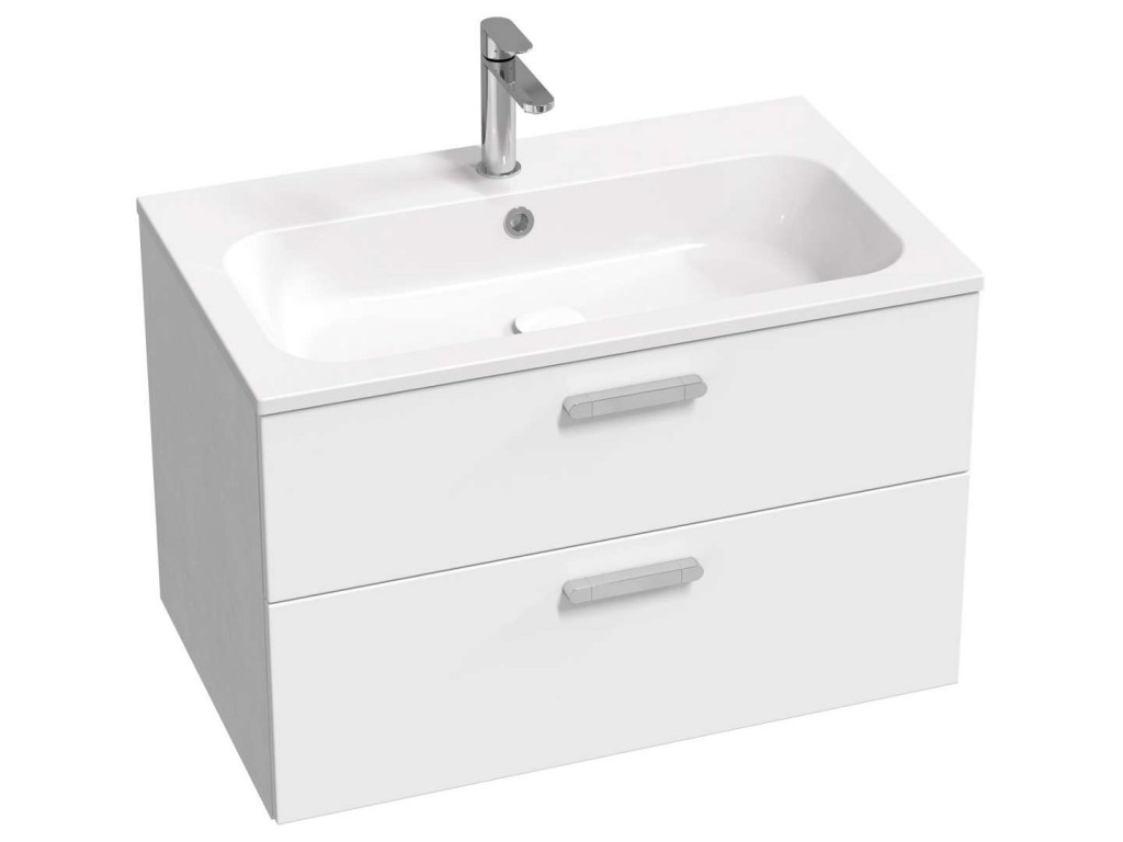 Skříňka pod umyvadlo Chrome II barva lesklá bílá materiál impregnovaná deska MFPB a MDF rozměry 800 x 500 x 490 mm 2 zásuvky s tichým dovíráním 2x madlo 152 mm, chrom instalace zavěšením na zeď dodáváno smontované Umyvadlo a baterie nejsou součástí balení, je třeba objednat zvlášť. Fotografie jsou ilustrativní.