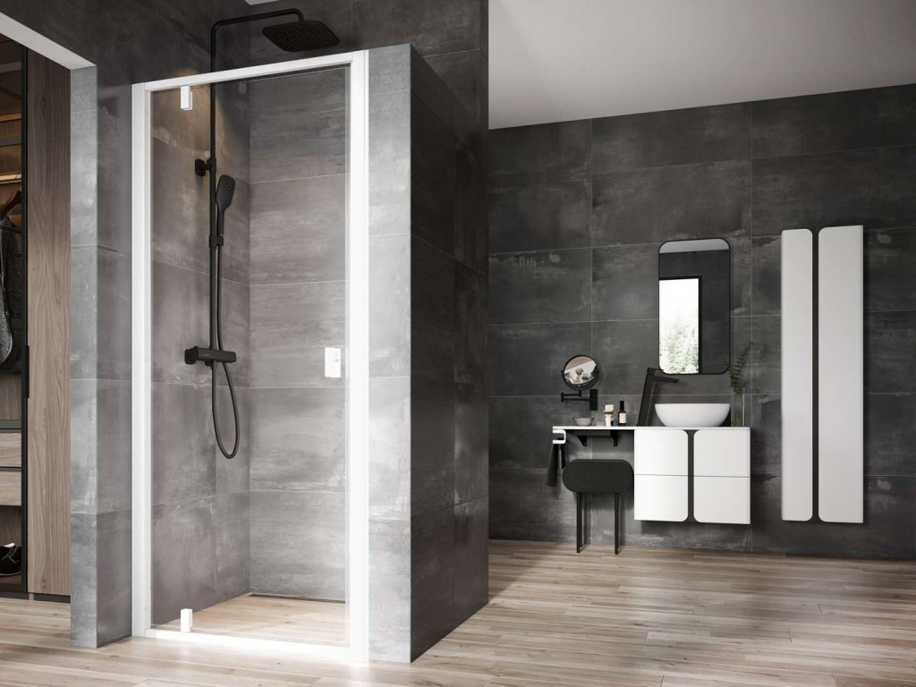 Sprchové dveře NDOP1 90 barva rámu: bílá matná šířka: 900 mm výška: 1950 mm vstup: 610 mm montážní rozměry: 877-927 x 1950 mm výplň: čiré bezpečnostní sklo tloušťky 6 mm hliníkový rám ochranná vrstva AntiCalc otevírání pomocí pivotového pantu rámové provedení výrobek se skládá z jednoho rovného otočného dílu, který tvoří dveře možnost otočení o 180° pro levou nebo pravou variantu otevírání dveří montáž do vyzděné niky nebo v kombinaci s pevnou stěnou NPSS instalace na vaničku nebo dlažbu použitím nastavovacího profilu NNPS lze výrobky rozšířit o 20 mm
