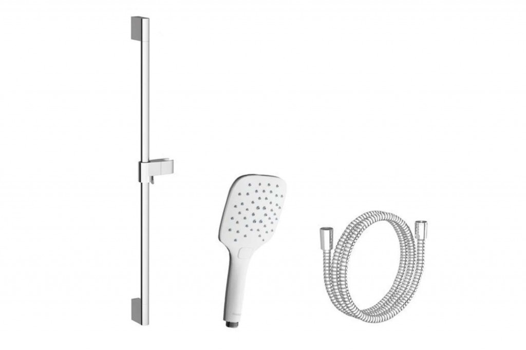 Ruční sprcha 921.00 se sprchovým příslušenstvím sprchová tyč, výška 700 mm s posuvným držákem sprchy OneHand sprchová hadice: 1500 mm z odolného plastu průměr sprchy 120 mm materiál: ABS plast 3 funkce: Jet, Rain, Jet + Rain vhodné: ke sprchovým, vanovým, podomítkovým bateriím a k termostatickým bateriím Vše v jednom pro váš maximální komfort při sprchování. Luxusní set s tyčí v designu konceptu Chrome zahrnuje dále ruční sprchu v bílé barvě, se třemi funkcemi a hadici z odolného plastu. Jezdec ruční sprchy lze po sprchové tyči posunovat jen jednou rukou, odpadá tak složitá a nepraktická manipulace při sprchování.