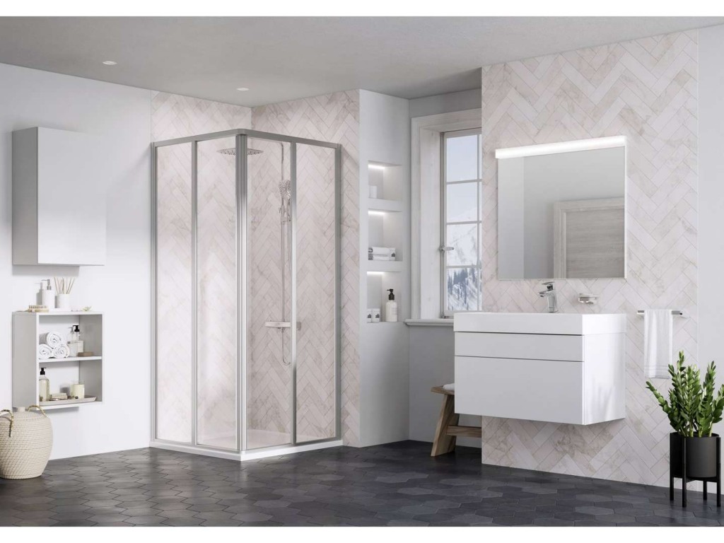 Čtvercový sprchový kout SRV2+SRV2 rozměry 800 x 800 mm výška 1950 mm šířka vstupu 431 mm výplň čiré bezpečnostní sklo, tloušťka 3 mm rámové provedení - rám satin rohový vstup - posuvné dveře AntiCalc pro snadné čištění AntiBlock tichý posuv dveří instalace na vaničku nebo na podlahu pro vyrovnání stavebních nerovností lze kombinovat s nastavovacím profilem Sprchová vanička není součástí balení.