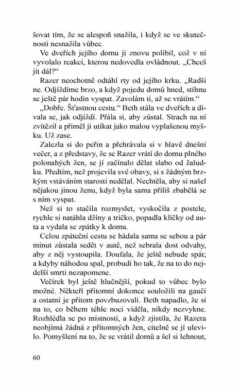 Beth Cornettová je hodná holka, takže se nehodlá zaplést s nikým z nebezpečného motorkářského klubu. Naneštěstí se jí podaří upoutat pozornost drsňáka Razera, který s ní má jasné úmysly. Když se ale naplní její nejhorší obavy, zůstane jí jen zlomené srdce. Razer se nikdy kvůli ničemu nehodlal změnit – ani kvůli Beth. Teprve když od něj zrazená uteče, dojde mu, že je jiná. A když se na scéně objeví zabiják, který chce Beth zavraždit, aby se pomstil motorkářskému klubu, rozhodne se: musí ji získat zpět.