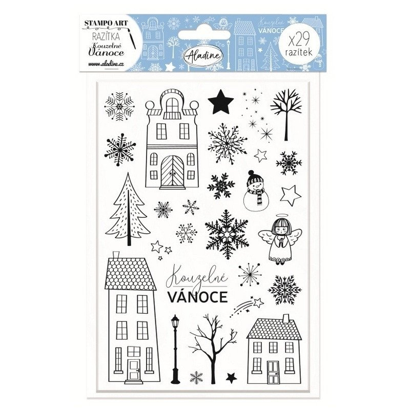 Sada originálních gumových razítek na pěnové hmotě s vánočními motivy domečků, sněhových vloček a stromků. Stačí je vyloupnout z pěnové desky a po práci je očištěné vrátit zpět pro jednoduché uskladnění. Používají se spolu s razítkovacími polštářky, doporučujeme voděodolné rychleschnoucí polštářky Aladine Izink Quick Dry. Razítka skvěle využijete při výrobě drobností z papíru – výrobě vánočních přání, jmenovek na dárečky nebo adventních kalendářů, dále se dají použít ke zdobení textilu, tvoření s keramickou hlínou i k dozdobení diářů. Motivy lze vybarvovat, vystřihovat, vrstvit apod. V sadě je 29 razítek, velikost nápisu „Krásné Vánoce“ je 4 x 2,5 cm, největší domeček měří 3 x 7,5 cm. Rozměr celého archu je 13 x 19 cm.