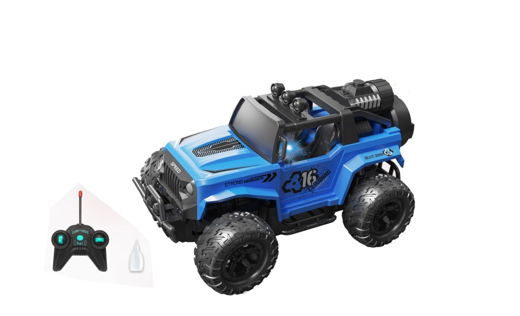 Terénní auto v měřítku 1:16. Auto jezdí vpřed, vzad a zatáčí, svítí mu světla, a navíc se mu při jízdě kouří z výfuku! Tužkové baterie pro provoz auta a ovladače nejsou součástí balení. V nabídce modrá a červená barva. Velikost autíčka 24×12,7×14,6 cm. Maximální rychlost 1,3 km/h. Frekvence 40MHz, frekvenční pásmo 40,680MHZ, maximální radiofrekvenční výkon 0,023mW, dosah dálkového ovládání 15m.