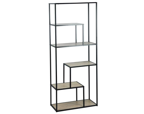 Moderní regál o šířce 70 cm má černou kovovou konstrukci a police v dekoru dub sonoma, které jsou zajímavě umístěny v různých výškových úrovních.