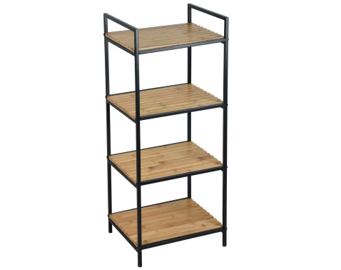 Malý regál se 4 policemi má rám konstrukce z černého kovu a police z bambusového dřeva. Rozměrově pasuje také do malého prostoru, například do koupelny.