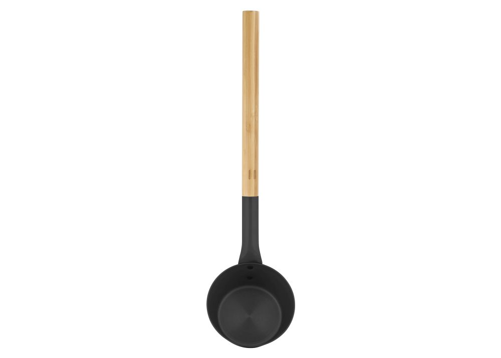 Krásná a stylová hliníková saunová naběračka v černé barvě s přírodní rukojetí z tepelně upraveného bambusu.