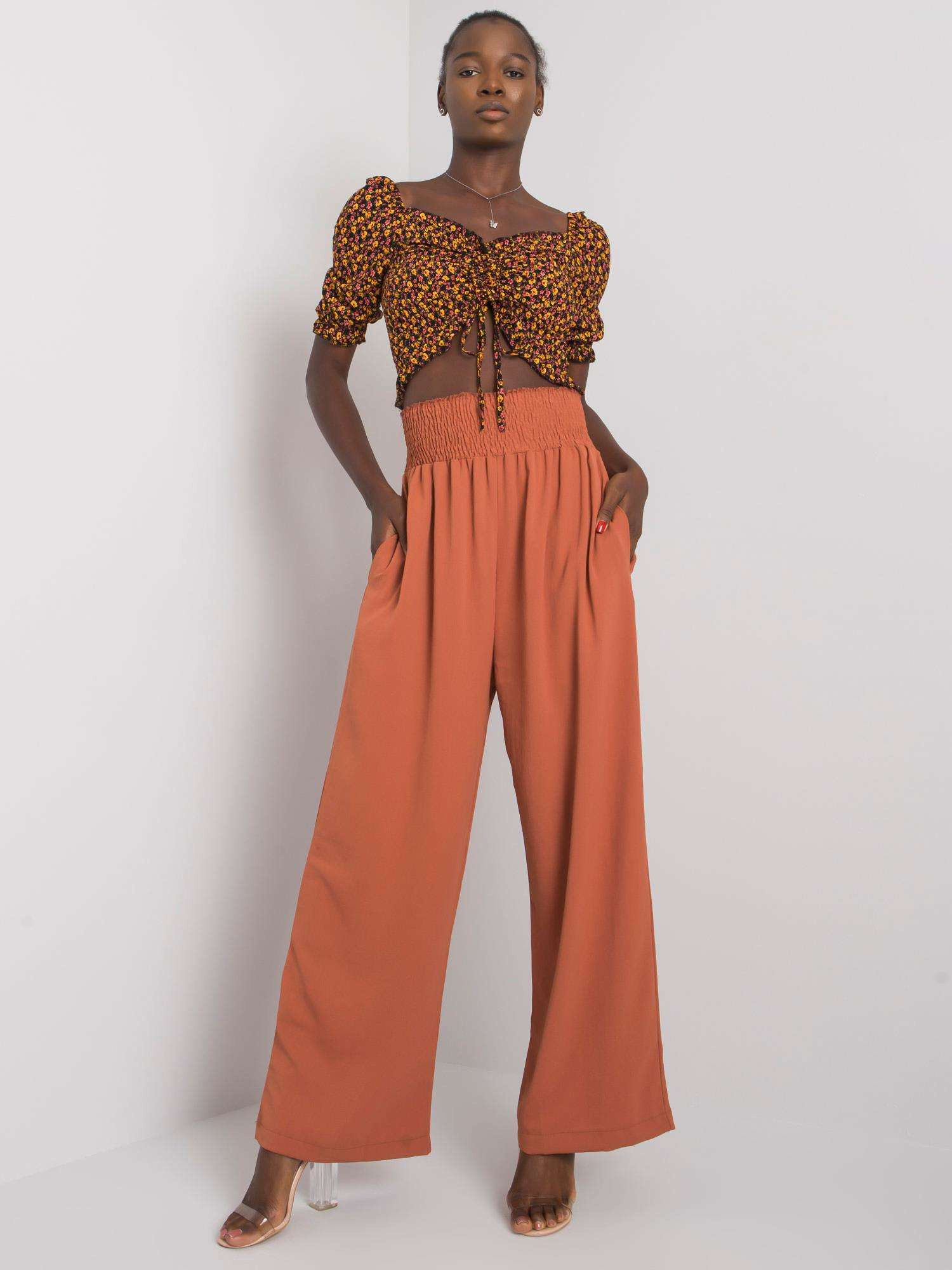 RUE PARIS Světle hnědé látkové kalhoty s vysokým pasem. Složení materiálu: 95% polyester, 5% elastan způsob praní: praní v pračce na 30 °C Modelka má na sobě velikost S. Rozměry modelky: výška 178 cm, poprsí 81 cm, pas 64 cm, boky 90 cm. Velikost kalhot S měřeno na plocho: šířka v pase - 36 cm, celková délka - 105 cm, výška v pase - 43 cmMezinárodní velikostVýškaObvod pasuObvod bokůVnější délka nohaviceDélka vnitřní nohaviceS36160-16872-80908774M38162-17278-86949075L40164-17484-901029476