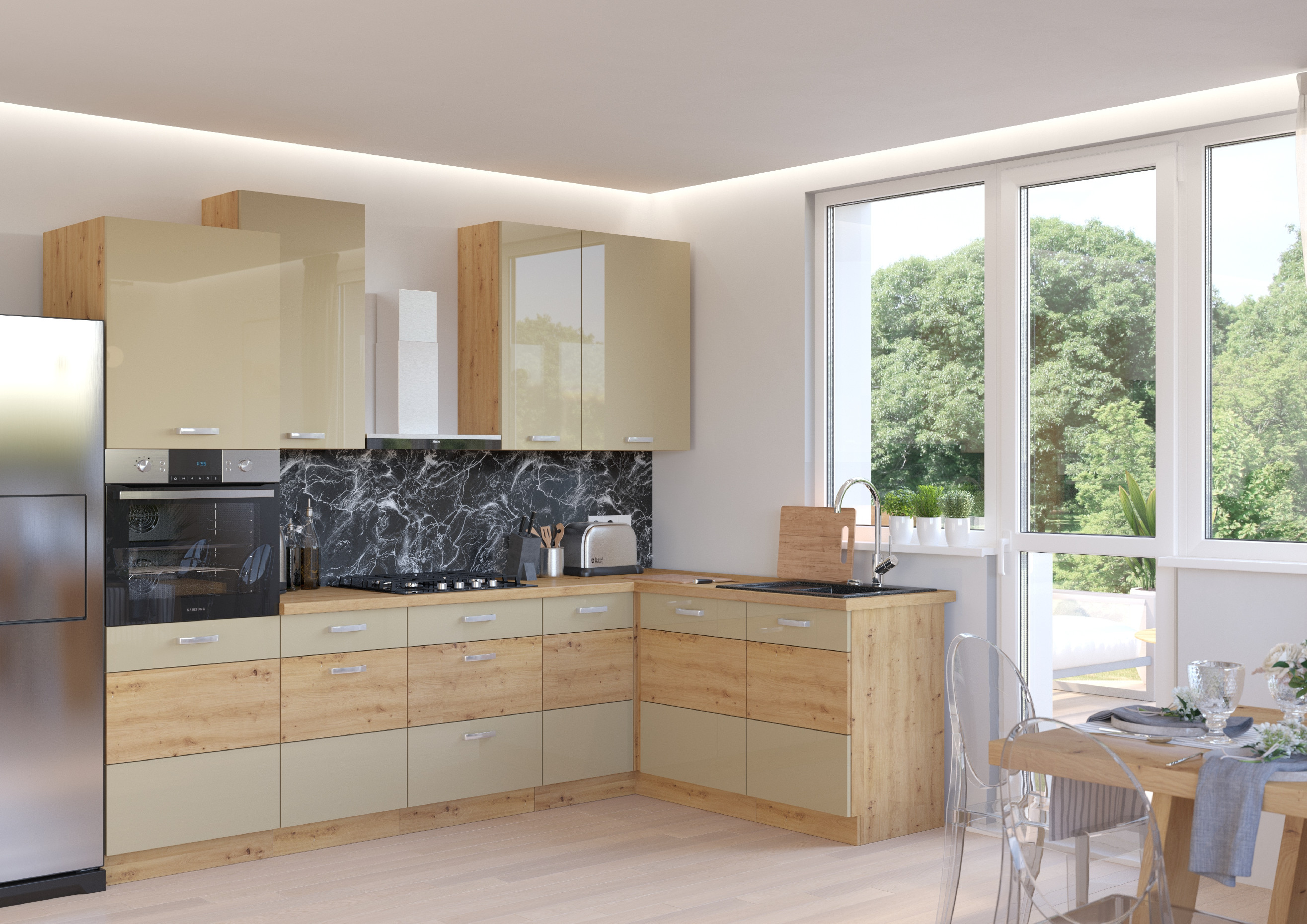 Kuchyňská linka Artisan 1 Kuchyňská linka Artisan 1 je doporučenou sestavou pro moderní kuchyně. Její kombinace lesklého povrchu a dřeva na dvířkách spodních skříněk dodává kuchyňské lince jedinečný vzhled. Všechny skříňky kuchyně jsou navíc variabilní, takže si je můžete sestavit dle vašich představ a potřeb. Buď můžete využít námi doporučenou sestavu nebo si vytvořit vlastní kombinaci. • Barevná kombinace kuchyňské linky Artisan 1Korpus je v dřevěném dekoru, dvířka v kombinaci dřeva a lesklého cappucina • Vlastnosti kuchyňské linky Artisan 1 Korpus a dvířka Korpus je vyroben z laminované desky o síle 16 mm. Dvířka a čela zásuvek Dvířka a čela zásuvek jsou vyrobeny z MDF desek o síle 16 mm. Hrany desek Hrany opatřeny ABS hranou o síle 1 mm nebo dýhou. Úchytky Jednotlivá dvířka a zásuvky se otevírají pomocí kovových úchytek. Tiché dovírání Dvířka a zásuvky jsou opatřeny tichým dovíráním. Horní výklopné skříňky Horní skříňky otevírání směrem nahoru mají závěsy s měkkým zavíráním (plynový píst). Vnitřek skříněk Vnitřek skříněk je bílý. • Rozměry kuchyňské linky Artisan 1 275 x 140 cm celková šířka 71,5 cm výška horních skříněk variabilní celková výška 210 cm výška vysoké skříňky 60 cm hloubka spodních skříněk s pracovní deskou 82 cm výška spodních skříněk 31 cm hloubka horních skříněk Horní skříňky lze umístit do libovolné výšky. • Skříňky použité v této kuchyňské sestavě Horní skříňky1 x 50 G-90 1F (1x dvířka)1 x 45 G-90 1F (1x dvířka)1 x 60 G-90 1F (1x dvířka)Spodní skříňky1 x 60 DP-210 2F (vysoká skříň na vestavnou troubu - 2x dvířka)1 x 50 D 1F 1S BB (2x dvířka) 1 x 60 D 3S BB (3x šuplík) 1 x 105 ND 1F BB1 x 80 ZL 2F BB • Pracovní desky ke kuchyňské lince Pracovní deska není v ceně, ale je možné si jí dokoupit v libovolné délce a provedení. Potřebný rozměr pracovní desky pro tuto kuchyňskou linku je 280 cm.Pracovní desky • Montážní závěsná lištaMontážní lišta je chytré řešení pro efektivní a snadnou instalaci horních skříněk ve vaší kuchyni nebo jiných prostorách. Nejprve se lišta upevní ke zdi, což zajistí stabilní a rovný základ pro následné zavěšení skříněk. Montážní lišta • Odkazy na příslušenství ke kuchyňským linkámPracovní deskyPříslušenství ke kuchynímKompletní nabídka skříněk ke kuchyňské lince Artisan •