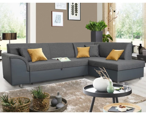 Rohová sedací souprava s pravým otomanem, rozkládací funkcí a úložným prostorem. Očalouněna antracitovou ekokůží a tmavě šedou tkaninou.