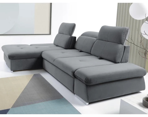 Komfortní rohová sedací souprava s otomanem vlevo, polohování sedáku, opěrek a područek. Rozkládací na lůžko, úložný prostor, ocelově šedá měkká látka.