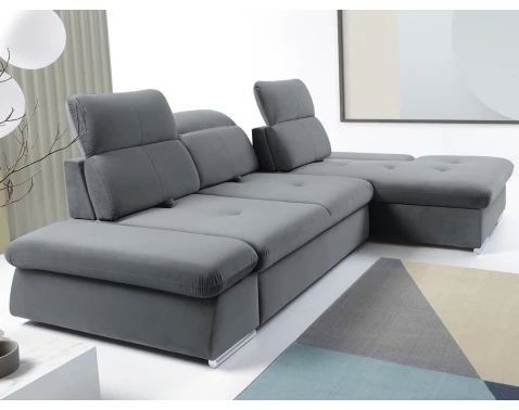 Komfortní rohová sedací souprava s otomanem vpravo, polohování sedáku, opěrek a područek. Rozkládací na lůžko, úložný prostor, ocelově šedá měkká látka.