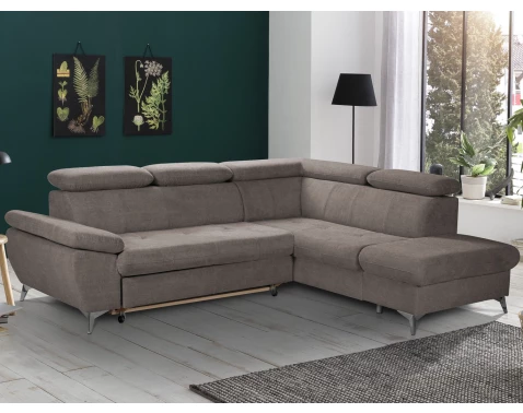 Moderní rohová sedací souprava v trendovém stylu nabízí komfortní sezení, které navíc doplňují polohovatelné područky a polohovatelné zádové opěrky - snadno si tak můžete přizpůsobit styl sezení podle Vaší individuální potřeby. Rohová sedačka tvoří pravý roh a je očalouněna příjemně měkkou strukturovanou látkou v odstínu hnědo-béžová taupe. Kovová podnož v chromově lesklém provedení působí vzdušně a navíc umožňuje využít i váš robotický vysavač. Tato sedačka je zároveň vybavena rozkládací funkcí na příležitostné lůžko a také úložným prostorem pod otomanem. Zkrátka sedačka pro komfortní, moderní a zároveň praktickou domácnost.