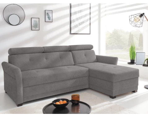 Rohová sedací souprava Harris v ocelově šedé barvě s polohovatelnými opěrkami, úložným prostorem a rozkladem na lůžko. Ideální volba do malého prostoru.