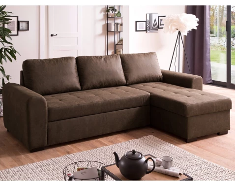 Rohová sedačka s rozkladem a úložným prostorem se hodí i do malého obýváku. Očalouněna hnědou látkou ve vintage optice kůže. Lze smontovat jako levý/pravý roh.