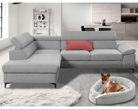 Moderní rohová sedačka s polohovatelnými opěrkami, rozkladem a úložným prostorem. Levý roh, světle šedý melír, vhodná do většiny bytů.