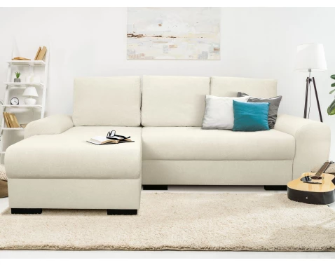 Rohová sedačka se zaoblenými tvary, velkými opěrnými polštáři, úložným místem a rozkladem. Sedací souprava může být univerzálně smontována jako pravý nebo levý roh. Očalouněna jemně strukturovanou látkou v barvě béžová.