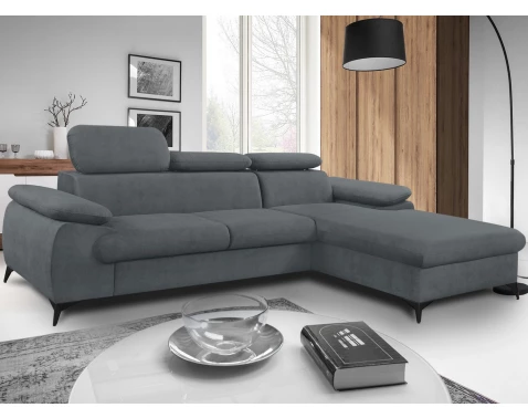 Moderní rohová sedačka Scala v ocelově šedé, pravý roh. Nastavitelné opěrky, úložný prostor a pohodlný design, ideální pro každý obývák. Kvalitní materiály.