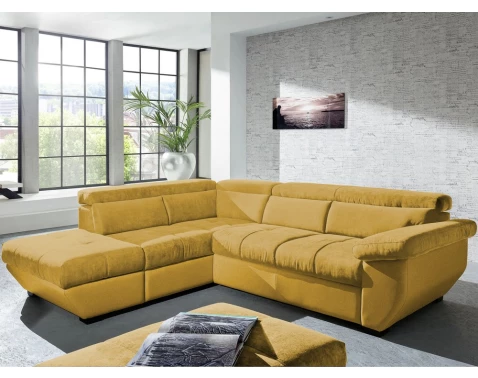 Rohová sedačka Speedway v hořčicově žluté s levým otomanem, polohovatelné opěrky, rozkládací funkce a úložný prostor pro maximální komfort a flexibilitu.