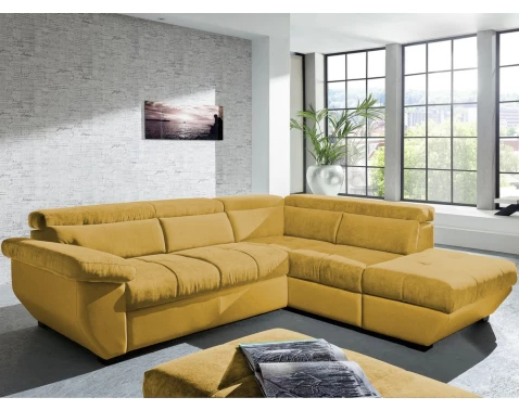 Rohová sedačka Speedway v hořčicově žluté s pravým otomanem nabízí komfortní sezení, polohovatelné opěrky, rozklad a úložný prostor pro moderní interiér.