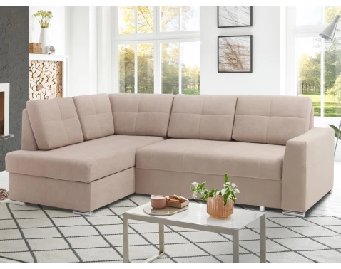 Sympatická rohová sedačka s otomanem vytváří levý roh. Očalouněna voděodolnou béžovou taupe látkou, s úložným prostorem a funkcí rozkladu na lůžko.