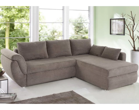 Rohová sedací souprava s polštáři a rozkladem na lůžko. Otoman lze umístit na pravou i levou stranu. Čalounění v měkké látce šedo-hnědé barvy taupe.