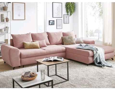 Atraktivní rohová sedací souprava se zaoblenými tvary a měkkým sezením. Očalouněna růžovou látkou, s úložným prostorem a rozkládací funkcí na lůžko.