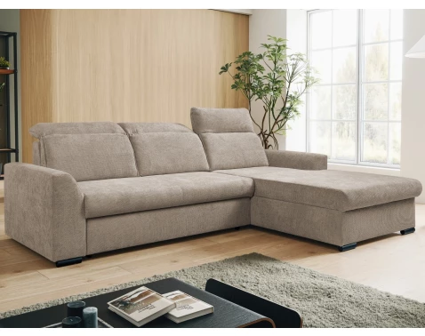 Komfortní rohová sedačka s polohovatelnými opěrkami do moderního obýváku. Očalouněna sametově hebkou strukturovanou tkaninou v barvě béžová cappuccino.