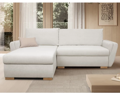 Elegantní malá rohová sedačka v krémové látce, s rozkládací funkcí, úložným prostorem a volitelným levým či pravým rohem. Stylová a odolná volba do obýváku.