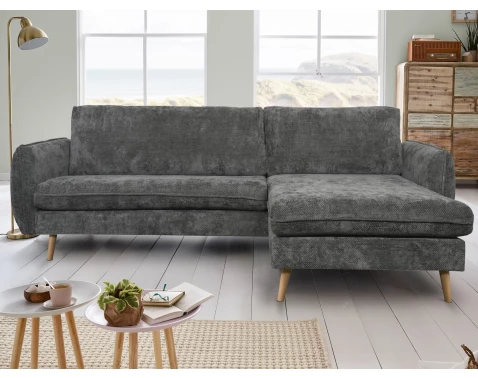 Pohodlná rohová sedačka s dřevěnými nohami působí v interieru útulně a lze sestavit jako pravý/levý roh. Očalouněna strukturovanou tkaninou v barvě grafitová.