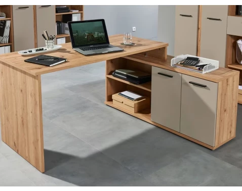 Rohový psací stůl s komodou z programu Kanada - moderní nábytek v kombinaci dřevodekoru dub artisan s kašmírově béžovými plochami vytvoří příjemné prostředí.