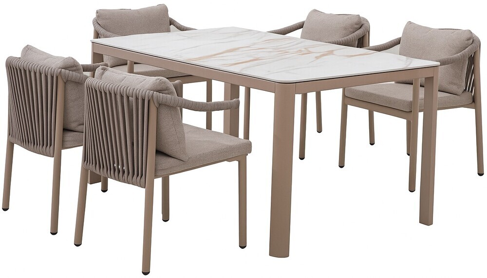 Luxusní hliníková souprava v cappuccino provedení, doplněna o velmi vkusný lankový, neboli provázkový výplet. Moderní souprava, která skvěle zapadne do každého exteriéru či interiéru.