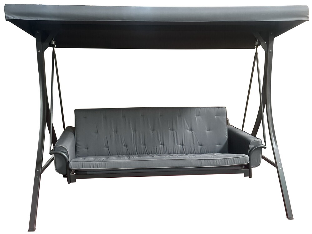 Ocelová konstrukce ošetřena práškovou barvou, podušky (polyester 160 g), výplň polyesterová vata, stříška (polyester 180 g), pro 3 osoby