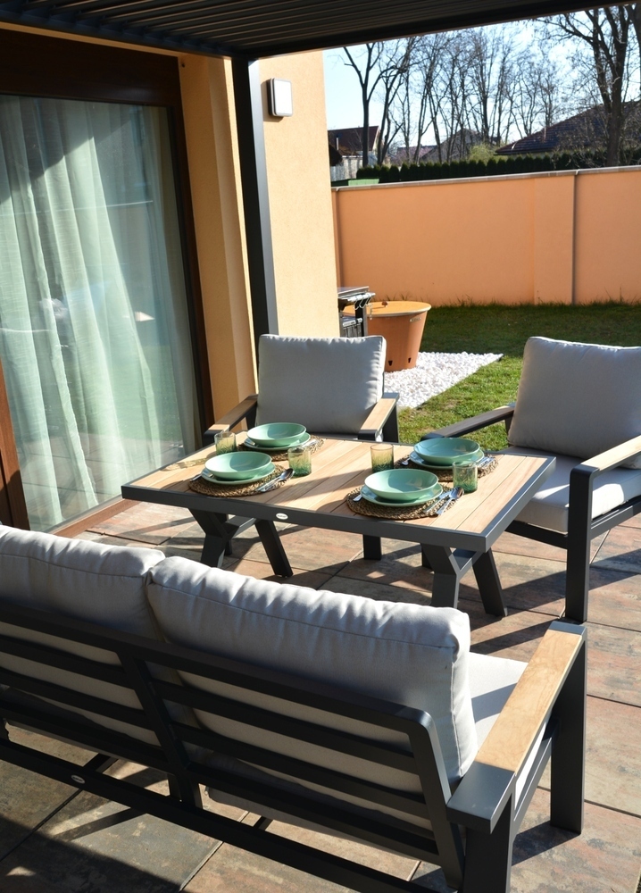 Luxusní hliníkový jídelní stůl v grafitovém provedení, doplněný o teakovou desku stolu.