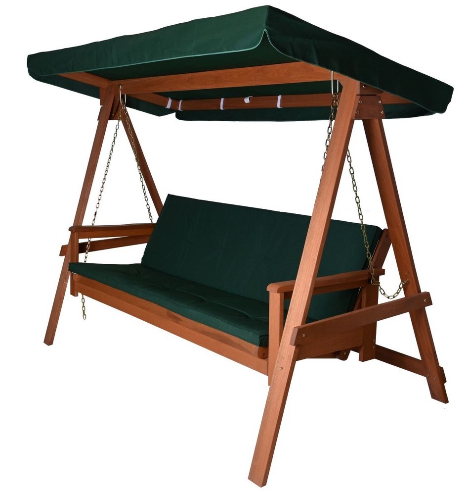 Masivní zahradní houpačka z tropického dřeva SHOREA. Podušky a stříška v zelené barvě - součást balení. Velmi kvalitní produkt!