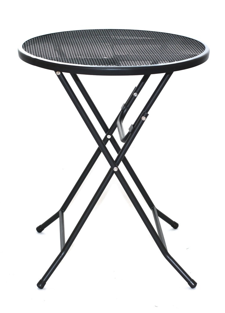 Skládací kovový zahradní stůl s drátěnou vrchní deskou.