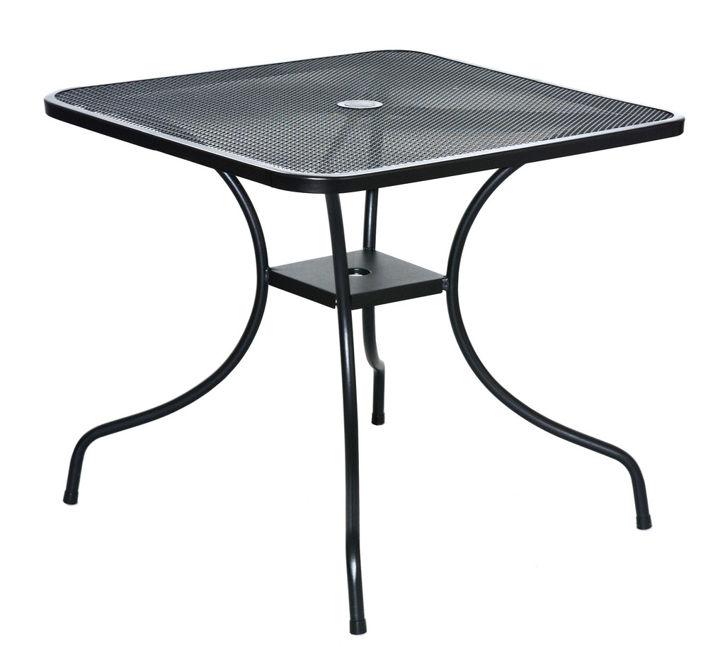Kovový zahradní stůl s drátěnou vrchní deskou čtvercového tvaru.