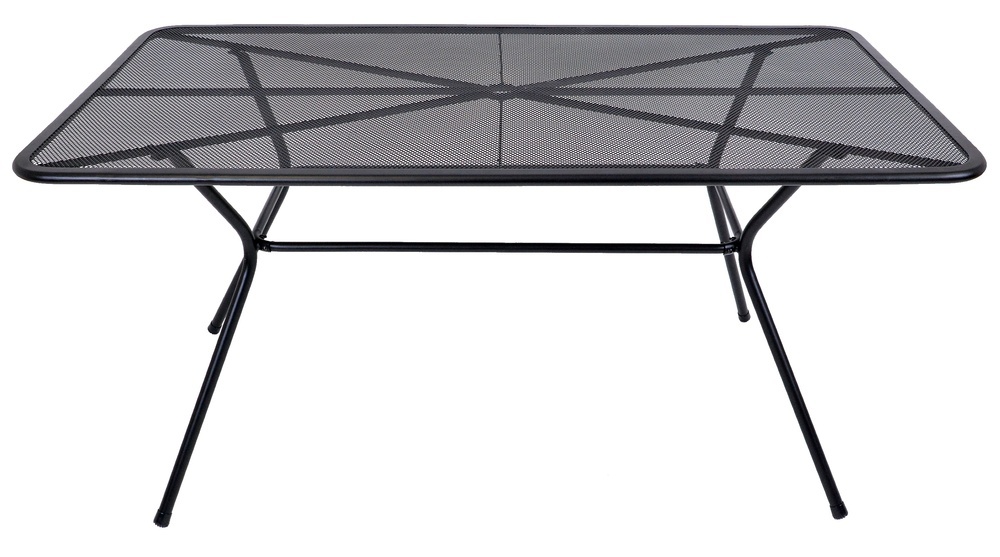 Kovový zahradní stůl s drátěnou vrchní deskou obdélníkového tvaru.