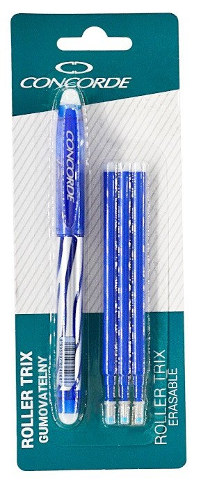 Gumovatelný inkoustový roller, který umí opravit vaše omyly. Napsaný text lze vymazat (zahřát) a následně přepsat. K vymazání slouží 2 koncovky z elastomeru umístěné na konci těla tužky a na víčku. Šíře hrotu 0,7 mm je vhodná pro psaní ve škole i v kanceláři. Pogumovaný trojboký úchop pro správné držení. Barva inkoustu odpovídá barvě těla. Blistrové balení je včetně 3 ks náplní Trix.
