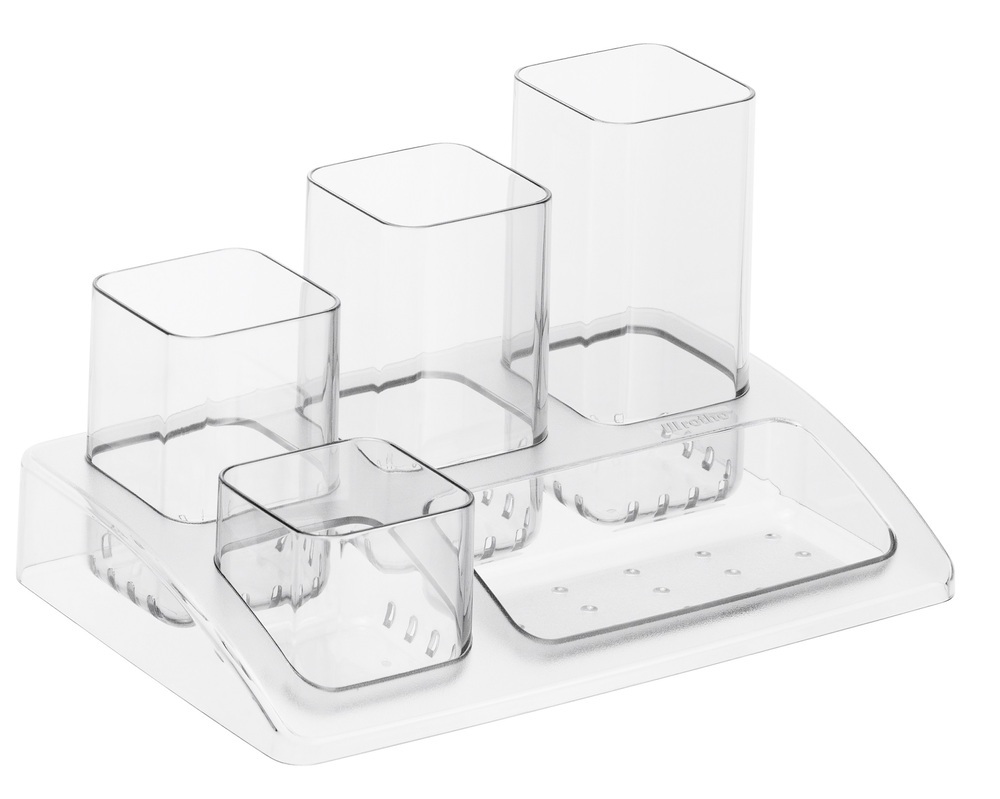 Držák na psací potřeby do kanceláře se čtyřmi různě vysokými přihrádkami a odkládací miskou. Držák je transparentní s vysokým leskem, snadno omyvatelný.