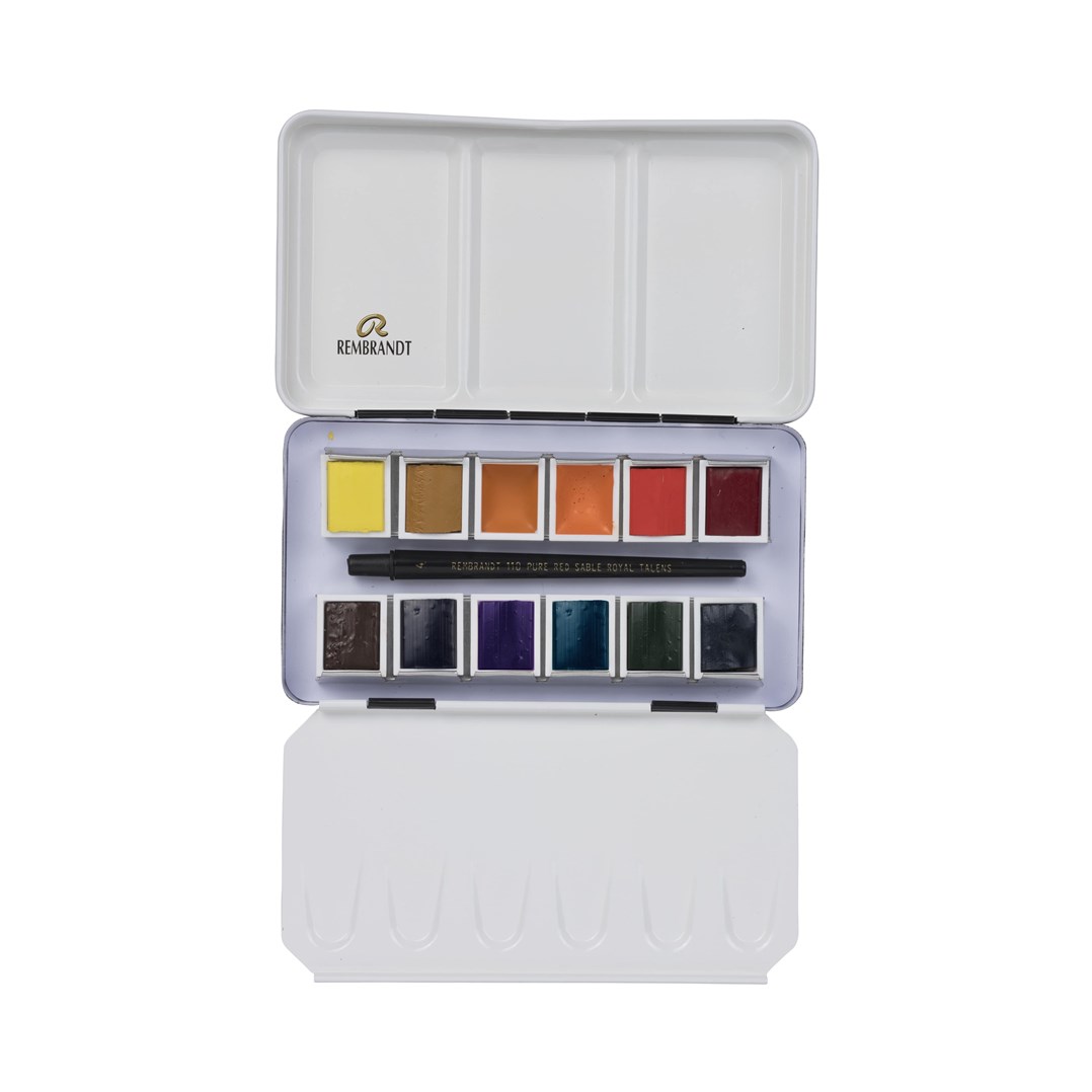 Rembrandt akvarelové barvy představuji nejvyšší, uměleckou/mistrovskou řadu akvarelových barev značky Royal Talens. Svými vlastnostmi barvy spojují tradici kvality s moderními technologiemi. Při výroby jsou použité nejkvalitnější ultrajemné pigmenty a čistá arabská guma. Díky jemnému mletí má barva vysokou světlostálost a dobrou kryvost při malé spotřebě barev, barvy velmi dobře drží na podkladu. Sada obsahuje 12 pánviček - 254, 234, 248, 297, 336, 377, 409, 506, 548, 550, 644, 675. Barvy jsou částečně transparentní. Součástí balení je také kulatý štětec série 110, velikosti 4, vlas je přírodní, sobolí. Plastová kazeta současně slouží jako paletka. Barvy jsou určené profesionálním umělců, nicméně jejich kvality ocení začínají í hobby výtvarníci. Sada je také vhodná jako cestovní, je skladná a dobře padne do ruky. Vybírat můžete z dalších mistrovských sad Rembrandt (celkem je v nabídce 5 mistrovských sad - Speciality colours, Opaque white and mixing, Portrait selection, Landscape selection, Granulating colours). Vyrobeno v Holandsku.