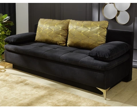 Pohovka v elegantním glamour stylu - očalouněna sametově hebkou látkou v barvě černá v kombinaci s leskle zlatými polštáři. Má úložný prostor i funkci rozkladu.
