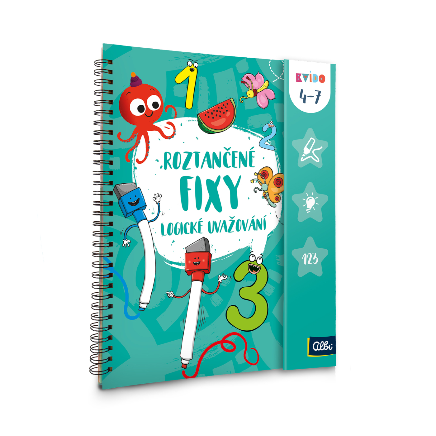 Procvičujte grafomotoriku s Kvídem a roztančenými fixami. 50 stran plných úkolů pro předškoláky a malé školáky. Díky mazatelným fixům lze sešit vyplňovat opakovaně. Sešit se zavíráním na magnet a 2 barevné fixy. Nově obsahují fixy všech vydání gumové delfínky, které napomáhají správnému úchopu.