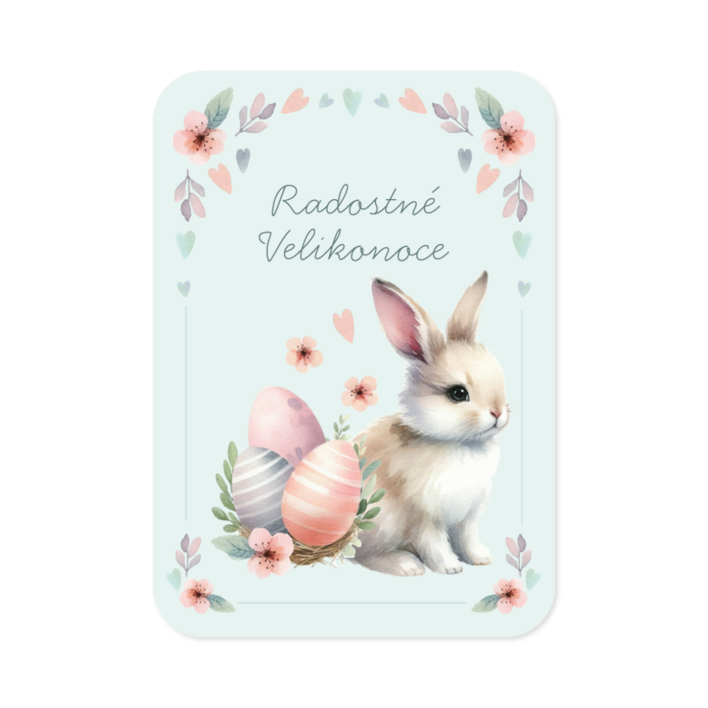 Velikonoční pohlednice s kulatými rohy, zajíčkem a textem Radostné Velikonoce. Zezadu věnování: Svátky jara plné radosti, hřejivého sluníčka, vůně květin i krásných chvil s blízkými přeje (…)