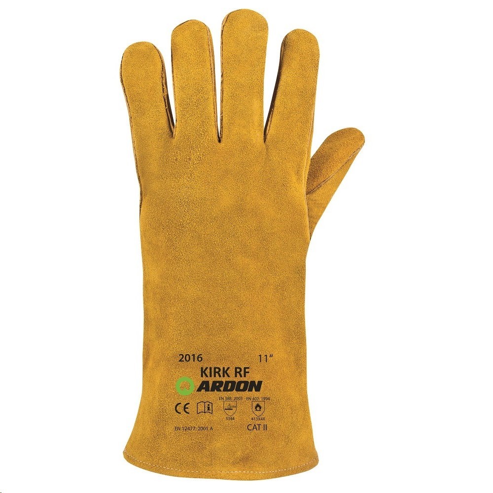 Rukavice KIRK RF A2046 celokožené do 100°C hovězí štípenka Svářečské práce kladou vysoké nároky na ochranné oblečení. Součástí výbavy musí být nejen pevná halena nebo zástěra, ale také svářecí rukavice. Rukavice KIRK nabízí vysokou ochranu rukou, kvalitním uzpůsobením i volbou materiálu plně vyhovují přísným podmínkám norem EN 388 3144X, EN 407 413X4X, EN 12477 A. Jsou vyrobeny z hovězí štípenky, která je na straně dlaně pro vyšší stupeň ochrany ještě zesílena. Hovězí štípenka vytvoří pevnou izolační vrstvu, která brání pronikání tepla i jisker. Propracovaný střih rukavic dovoluje snadné oblékání a pouze minimálně omezuje hybnost rukou a prstů. V rukavicích je možné pevně a bezpečně držet nářadí, materiál i další vybavení. Svářecí rukavice KIRK vám zásadně ulehčí práci při sváření a zajistí dostatečnou ochranu. Vybavte se kvalitními pracovními pomůckami, myslete na své zdraví a bezpečnost. svářecí rukavice kevlarové švy barva: žlutá materiál dlaně: hovězí štípenka, zesílená materiál hřbetu: hovězí štípenka norma: EN 388 3144X, EN 407 413X4X, EN 12477 A velikost: 11