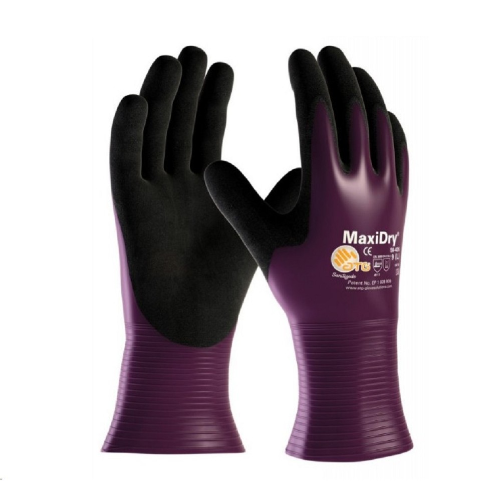 Rukavice MAXIDRY 56-426 celomáčené+manžeta fialové ochranné rukavice poskytují bariérovou ochranu proti olejům lehké, tenké, pružné, pohodlné, nesnižují obratnost bezpečný úchop, protiskluzová povrchová úprava „micro-cup“ celomáčené + manžeta tloušťka dlaně: 1,1 mm délka: 250 mm Velikost :7, 8,9,10,11 Barva: fialová